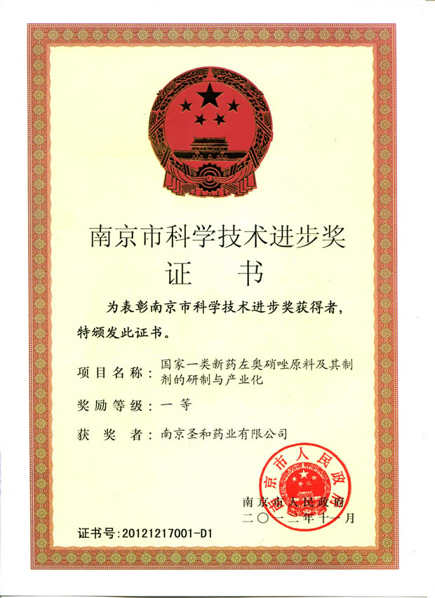2012南京市科學(xué)技術(shù)進(jìn)步獎(jiǎng) 左奧硝唑原料及其制劑的研制和產(chǎn)業(yè)化