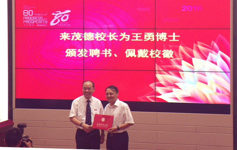 聘請儀式在中國藥科大學江寧校區(qū)經管文樓111報告廳舉行,研究生院常務副院長邵蓉教授主持了此次儀式。人事處齊煉文處長宣讀了聘任文件,來茂德校長親自為王勇博士頒發(fā)聘書、佩戴?;?。