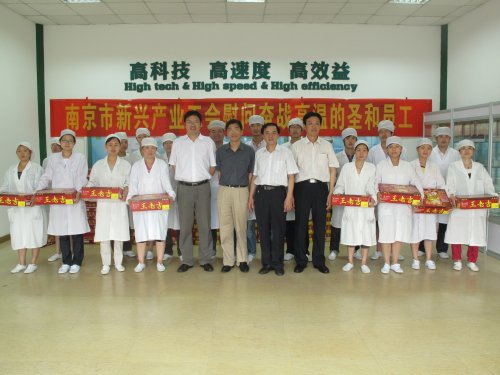 7月15日,夏日炎炎,南京市新興產(chǎn)業(yè)工會(huì)王軍主任、朱耀華處長(zhǎng)一行五人在戚良猛副總經(jīng)理的陪同下,冒著酷暑來到我司新港生產(chǎn)基地,慰問奮戰(zhàn)在生產(chǎn)一線的廣大職工,為一線職工送上了防暑降溫慰問品,給職工們帶來了清涼和關(guān)懷。