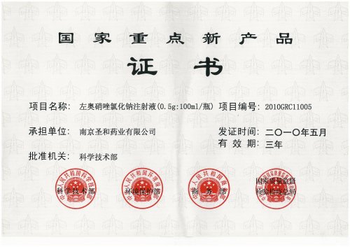 左奧硝唑氯化鈉注射液于2009年8月獲得國家食品藥品監(jiān)督管理局新藥證書及藥品注冊批件,并已獲得國家發(fā)明專利5項(xiàng),國際專利2項(xiàng),并獲得“2009年中國十方處方藥重磅新品”,現(xiàn)已正式上市銷售。