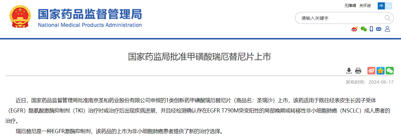 2024年11月28日,國(guó)家醫(yī)療保障局正式發(fā)布通知,宣布圣瑞沙®(甲磺酸瑞厄替尼片)(發(fā)明專利 專利號(hào)ZL201711...